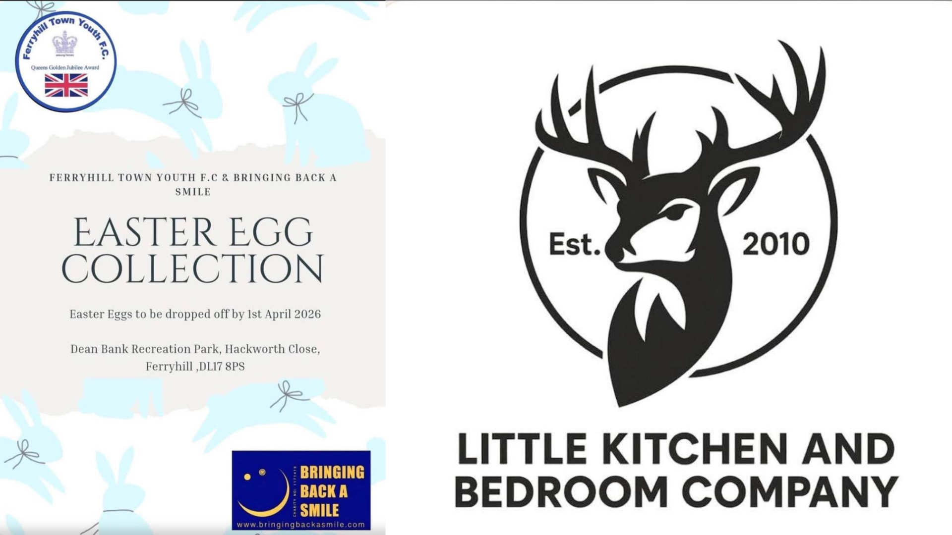 🐣 Our Easter Egg Hospital 🏥 Run is up and running I would like to say a massive thank you to Wayne from Little Kitchen & Bedroom Company who have kindly started us off with a £100.00 donation towards Easter Eggs and also big thank you to Ferryhill Youth Football who are also offering a drop off point. On behalf of the team thank you so much. Drop off or pick up available 👍💙🐰🐥
